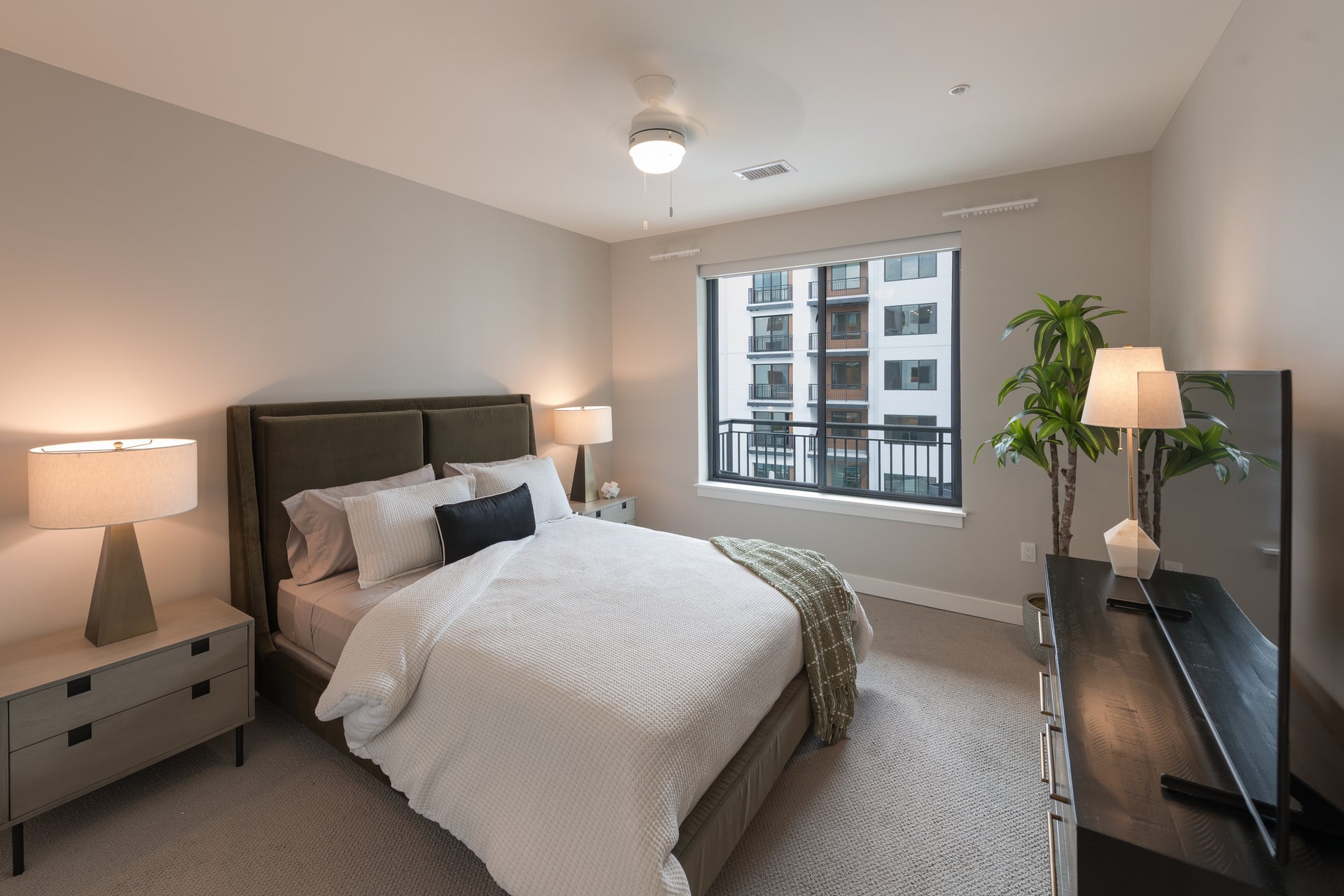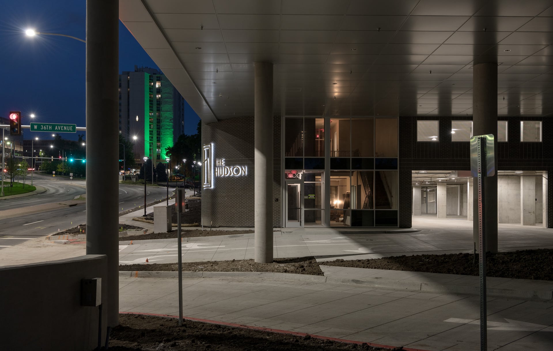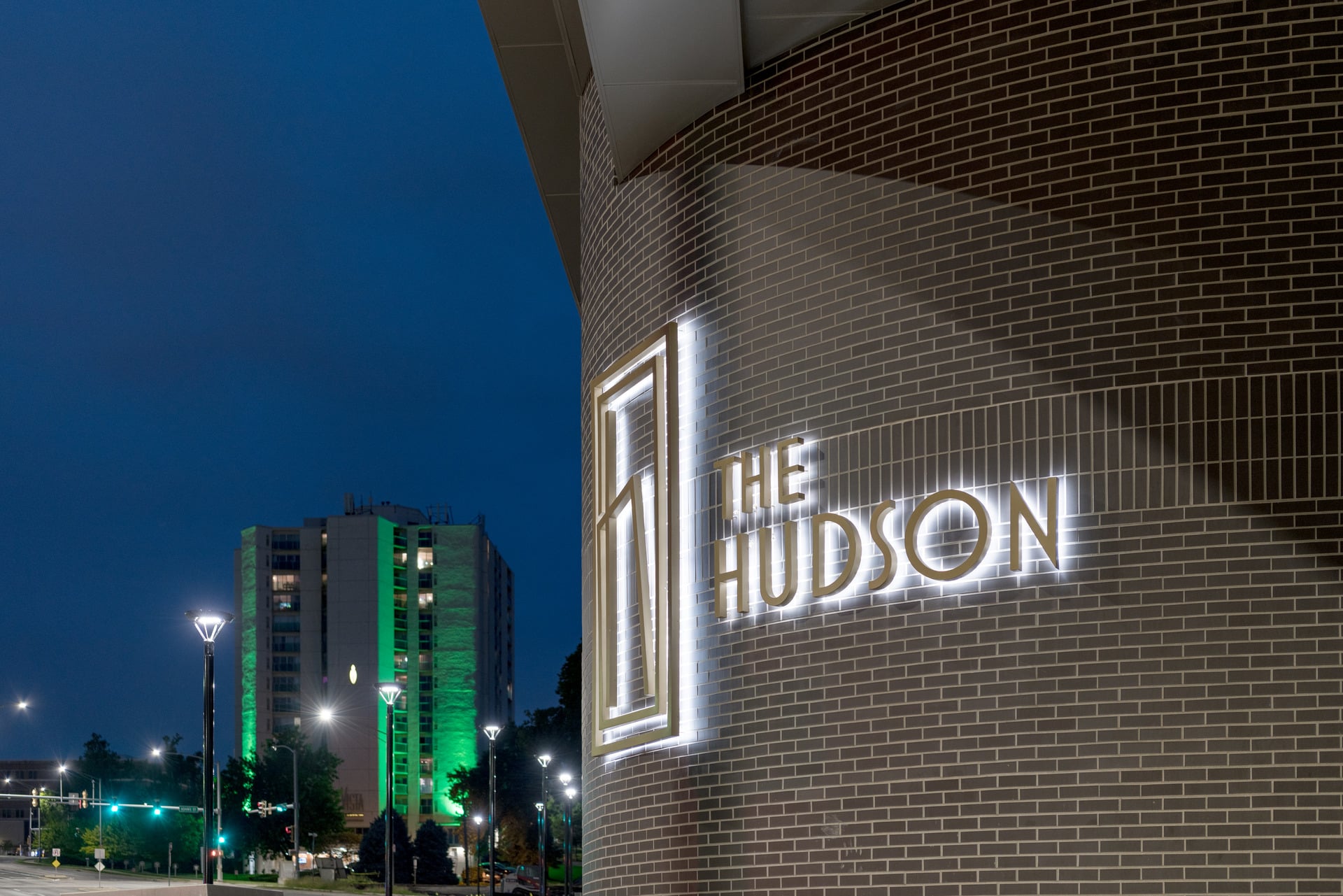 From concept to creation, The Hudson’s design aims to blend with the surrounding campus’ architecture, while also creating its own unique identity. Design elements include a curvilinear charcoal brick around the base of the building and entries, providing wayfinding for residents and guests. The private residential units are accented with blocks of bright metal panels, light wood-tone accents and glass for a sleek, clean and modern aesthetic.